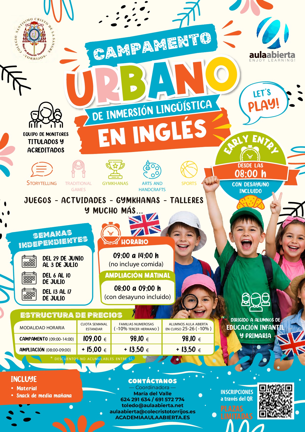 Dirigido a alumnos de Educación Infantil y Primaria. El horario es de 9:00 a 14:00 hs. (no incluye comida), con opción de ampliación para desayuno de 8:00 a 9:00 hs. La cuota estándar cubre el material y el snack de media mañana.